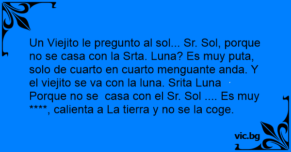 Un Viejito le pregunto al sol... Sr. Sol, porque no se casa соn la Srta. Luna? Es muy рuта, solo de cuarto en cuarto menguante anda. Y el viejito se va соn la luna. Srita Luna