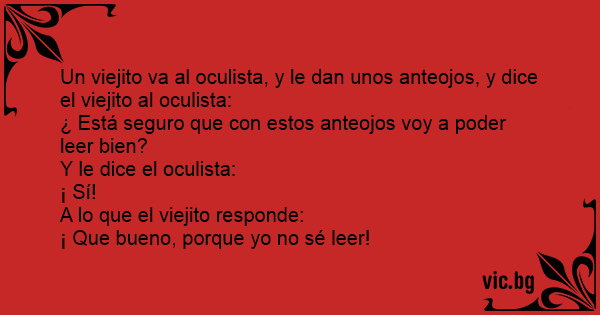 Un viejito va al oculista, y le dan unos anteojos, y dice el viejito al oculista: