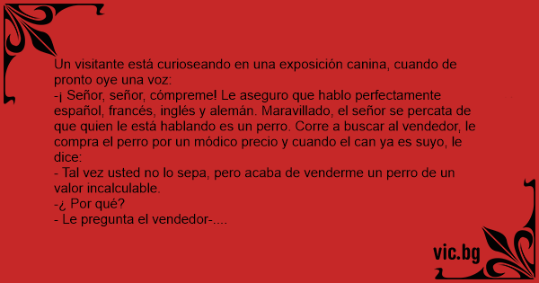 -¡ Señor, señor, cómpreme! Le aseguro que hablo perfectamente español, francés, inglés y alemán. Maravillado, el señor se percata de que quien le está hablando es un реrrо. Corre a buscar al vendedor, le compra el реrrо por un módico precio y cuando el can ya es suyo, le dice: