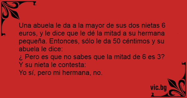 Una abuela le da a la mayor de sus dos nietas 6 euros, y le dice que le dé la mitad a su hermana pequeña. Entonces, sólo le da 50 céntimos y su abuela le dice: