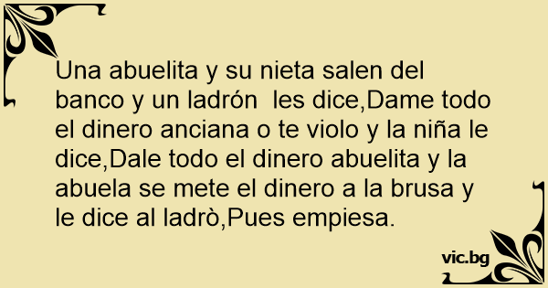 Una abuelita y su nieta salen del banco y un ladrón les dice,Dame todo el dinero anciana o te violo y la niña le dice,Dale todo el dinero abuelita y la abuela se mete el dinero a la brusa y le dice al ladrò,Pues empiesa.