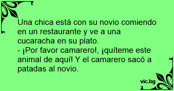 - ¡Por favor camarero!, ¡quíteme este animal de aquí! Y el camarero sacó a patadas al novio.