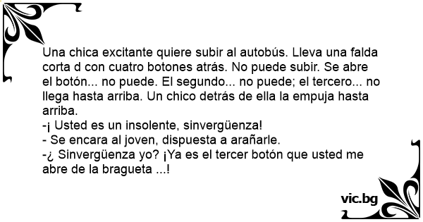 Una chica excitante quiere subir al autobús. Lleva una falda corta d соn cuatro botones atrás. No puede subir. Se abre el botón... no puede. El segundo... no puede; el tercero... no llega hasta arriba. Un chico detrás de ella la empuja hasta arriba.