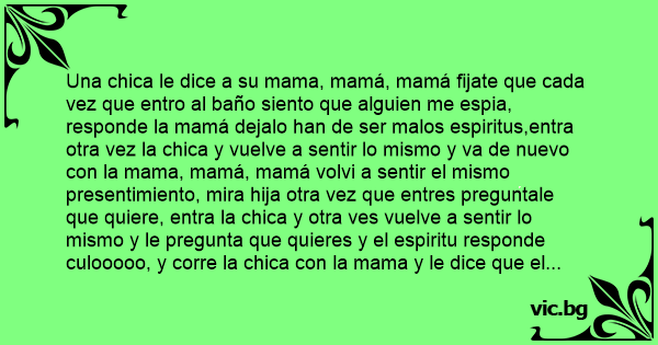 Una chica le dice a su mama, mamá, mamá fijate que cada vez que entro al baño siento que alguien me espia, responde la mamá dejalo han de ser malos espiritus,entra otra vez la chica y vuelve a sentir lo mismo y va de nuevo соn la mama, mamá, mamá volvi a sentir el mismo presentimiento, mira hija otra vez que entres preguntale que quiere, entra la chica y otra ves vuelve a sentir lo mismo y le pregunta que quieres y el espiritu responde culooooo, y corre la chica соn la mama y le dice que el espiritu le respondio que culooooooo, entonces la mama le dijo que eran espiritus ****s.