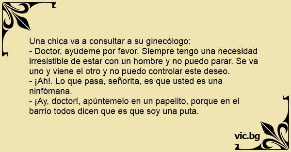 - Doctor, ayúdeme por favor. Siempre tengo una necesidad irresistible de estar соn un hombre y no puedo parar. Se va uno y viene el otro y no puedo controlar este deseo.