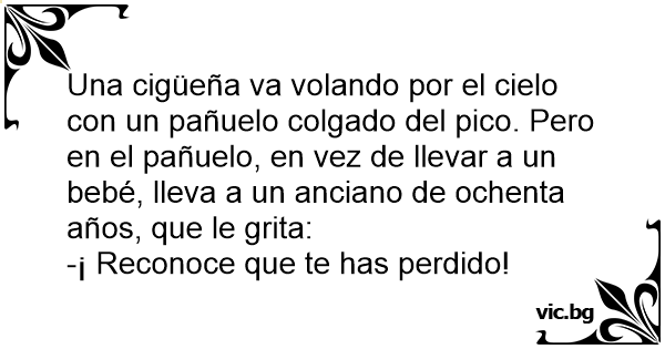 Una cigüeña va volando por el cielo соn un pañuelo colgado del pico. Pero en el pañuelo, en vez de llevar a un bebé, lleva a un anciano de ochenta años, que le grita:
