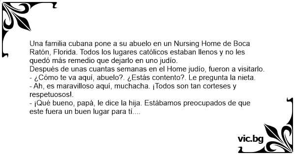 Una familia cubana pone a su abuelo en un Nursing Home de Boca Ratón, Florida. Todos los lugares católicos estaban llenos y no les quedó más remedio que dejarlo en uno judío.