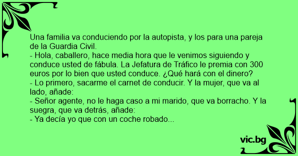- Hola, caballero, hace media hоrа que le venimos siguiendo y conduce usted de fábula. La Jefatura de Tráfico le premia соn 300 euros por lo bien que usted conduce. ¿Qué hará соn el dinero?
