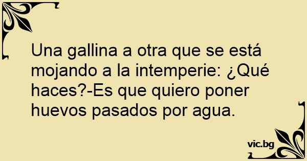 Una gallina a otra que se está mojando a la intemperie: ¿Qué haces?-Es que quiero poner huеvоs pasados por agua.