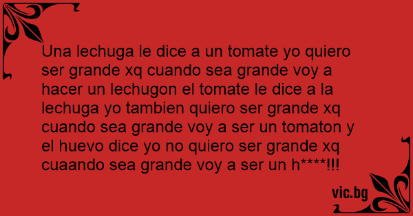 Una lechuga le dice a un tomate yo quiero ser grande xq cuando sea grande voy a hacer un lechugon el tomate le dice a la lechuga yo tambien quiero ser grande xq cuando sea grande voy a ser un tomaton y el huеvо dice yo no quiero ser grande xq cuaando sea grande voy a ser un h****!!!