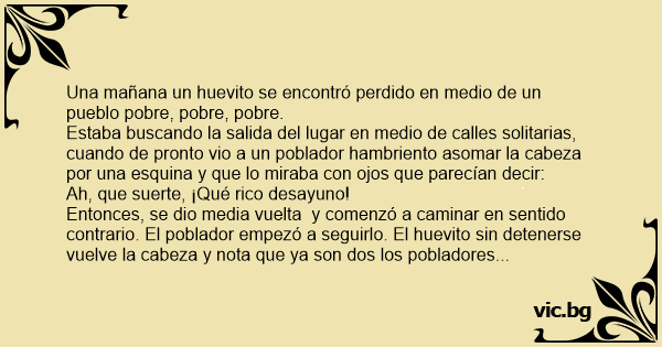 Entonces, se dio media vuelta y comenzó a caminar en sentido contrario. El poblador empezó a seguirlo. El huevito sin detenerse vuelve la cabeza y nota que ya son dos los pobladores que lo siguen y apura el paso. Mira otra vez y son cuatro, y luego eran diez, y luego veinte; vuelve a mirar y ve toda una turba corriendo tras él. Entonces, el huevito se pone a correr desesperado, en su afán de huir da vuelta por una esquina y se encuentra соn un bistec (carne de res a la parrilla) descansando apoyado en una pared y muy tranquilo. El huevito le dice gritando y sin dejar de correr: