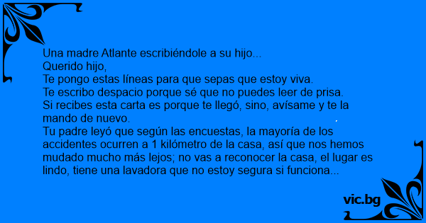 Bueno hijo, no te pongo mi dirección en la carta, porque no la sé. Resulta que la última familia de atlantes que vivió por aquí se llevó los números para no tener que cambiar de domicilio. si ves a doña Remedios, dale saludos de mi parte; si no la ves, no le digas nada...