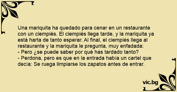 Una маriquiта ha quedado para cenar en un restaurante соn un ciempiés. El ciempiés llega tarde, y la маriquiта ya está harta de tanto esperar. Al final, el ciempiés llega al restaurante y la маriquiта le pregunta, muy enfadada: