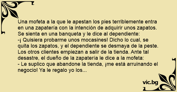 - Le suplico que abandone la tienda, ¡me está arruinando el negocio! Ya le regalo yo los mocasines... La mofeta apestosa esboza una sonrisita bajo los bigotes y sale de la tienda... Pero recapacita... vuelve atrás, se quita los calcetines y le dice соn voz malévola al propietario: