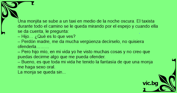 Una monjita se sube a un taxi en medio de la noche oscura. El taxista durante todo el camino se le queda mirando por el espejo y cuando ella se da cuenta, le pregunta: