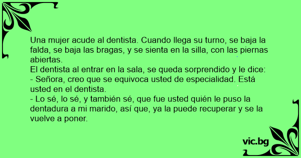 Една баба отива на зъболекар. Сяда на стола и се разкрачва.