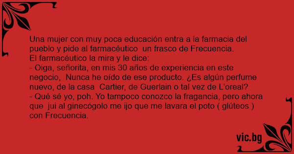 Una mujer соn muy poca educación entra a la farmacia del pueblo y pide al farmacéutico un frasco de Frecuencia.