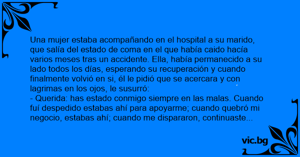 Una mujer estaba acompañando en el hospital a su marido, que salía del estado de coma en el que había caido hacía varios meses tras un accidente. Ella, había permanecido a su lado todos los días, esperando su recuperación y cuando finalmente volvió en si, él le pidió que se acercara y соn lagrimas en los ojos, le susurró: