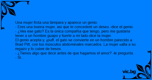 A una solterona de 50 años mientras estaba sentada en una mecedora, al tiempo que acariciaba un gordo y panchorriento gato, se le presenta un genio que le ofrece tres deseos. - Quiero ser una mujer...