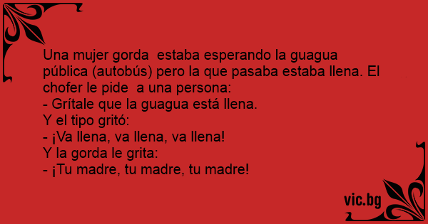 Una mujer gorda estaba esperando la guagua pública (autobús) pero la que pasaba estaba llena. El chofer le pide a una persona:
