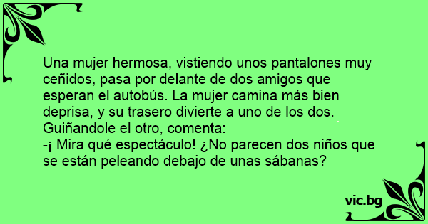 Una mujer hermosa, vistiendo unos pantalones muy ceñidos, pasa por delante de dos amigos que esperan el autobús. La mujer camina más bien deprisa, y su trasero divierte a uno de los dos. Guiñandole el otro, comenta: