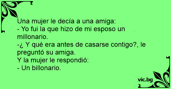 Uma mulher estava conversando com uma amiga: — Fui eu que fiz o meu marido milionário! Pergunta a amiga: — E o que seu marido era antes? A mulher responde: — Bilionário.