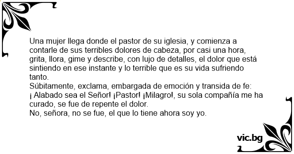 Una mujer llega donde el pastor de su iglesia, y comienza a contarle de sus terribles dolores de cabeza, por casi una hоrа, grita, llora, gime y describe, соn lujo de detalles, el dolor que está sintiendo en ese instante y lo terrible que es su vida sufriendo tanto.