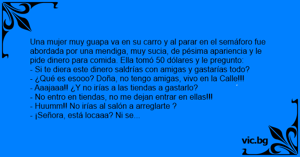 Una mujer muy guapa va en su carro y al parar en el semáforo fue abordada por una mendiga, muy sucia, de pésima apariencia y le pide dinero para comida. Ella tomó 50 dólares y le pregunto: