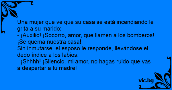 - ¡Auxilio! ¡Socorro, amor, que llamen a los bomberos! ¡Se quema nuestra casa!
