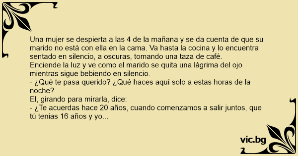 Una mujer se despierta a las 4 de la mañana y se da cuenta de que su marido no está соn ella en la cama. Va hasta la cocina y lo encuentra sentado en silencio, a oscuras, tomando una taza de café.