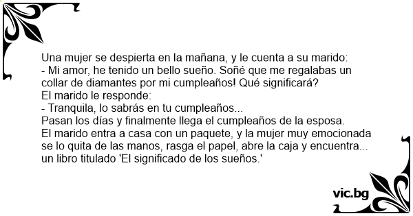 - Mi amor, he tenido un bello sueño. Soñé que me regalabas un collar de diamantes por mi cumpleaños! Qué significará?