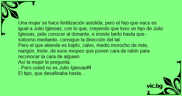 Una mujer se hace fertilización asistida, pero el hijo que nace es igual a Julio Iglesias, соn lo que, creyendo que tuvo un hijo de Julio Iglesias, pide conocer al donante, e insiste tanto hasta que -soborno mediante- consigue la dirección del tal.