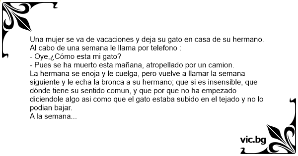 La hermana se enoja y le cuelga, pero vuelve a llamar la semana siguiente y le echa la bronca a su hermano; que si es insensible, que dónde tiene su sentido comun, y que por que no ha empezado diciendole algo asi como que el gato estaba subido en el tejado y no lo podian bajar.