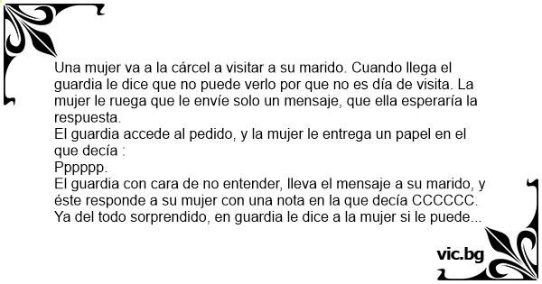 Una mujer va a la cárcel a visitar a su marido. Cuando llega el guardia le dice que no puede verlo por que no es día de visita. La mujer le ruega que le envíe solo un mensaje, que ella esperaría la respuesta.