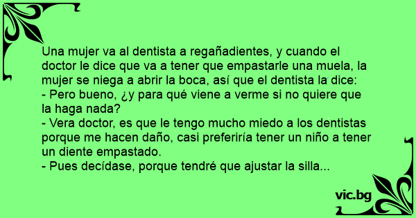 Was ist schmerzvoller Η ιδιαίτερη...προτίμηση Ακόμη 3 Ιατρικά Момиче казва на зъболекаря: - Леле докторе, многу ми е страв од заболекар! Подобро да родам уште едно дете! - Зубы у Вас плохие, предстоит много работы. Στο οδοντοιατρείο, η ασθενής: Eine Frau beim Zahnarzt: "Ich weiß nicht, was schlimmer ist: an den Zähnen gebohrt zu werden, oder ein Kind zu bekommen." Der Arzt: "Sie müssen sich entscheiden, damit ich den Stuhl entsprechend einstellen kann..." Une femme qui arrive chez le dentiste dit à son assistante: - Je viens pour me faire retirer une dent. Alors l'assistante lui répond: - Eh bien, vous en avez du courage! Et la patiente répond: - Oh... A madame vai ao dentista, e diz: — Ai doutor, eu tenho mais medo de arrancar um dente do que ter um filho! Ao que o dentista diz: — Decida-se logo, para que eu ajeite a posição da cadeira. Przychodzi baba do dentysty i trzęsie się ze strachu: - Tak się strasznie boję, panie doktorze. Wolałabym chyba rodzić, niż dać sobie rwać zęby... - To niech się pani zdecyduje żebym wiedział,... La señora llega al dentista y dice: - ¡Ay, qué miedo tengo, doctor!. Creo que casi preferiría tener un hijo antes que sacarme la muela. - Bueno mujer, pues dígame usted por cual de las dos cosas se... En tiedä, kumpi on kamalampaa, hampaan poisto vai lapsen teko, huokaisi nainen hammaslääkärille. - Päättäkää nopeasti, jotta tiedän, mihin asentoon säädän tuolin. Przychodzi baba do dentysty: - Panie doktorze, tak strasznie boje się borowania, że chyba wołałabym już zajść w ciąże. - To niech się pani zdecyduje, bo nie wiem, jak fotel mam ustawić. - Doktor úr, rettenetesen félek a foghúzástól. Esküszöm inkább szülnék még egy gyereket. - Döntse el asszonyom, mert akkor úgy állítom a széket... Un gars souffre terriblement de ses dents depuis trois jours. Mais comme il a très peur du dentiste, il refuse d'y aller. N'en pouvant plus de l'entendre hurler, sa femme appelle ses 2 frères et... Fogorvosnál egy gyönyörű nő hangosan morfondírozik: - Mi lehet fájdalmasabb, kihúzatni egy fogat, vagy szülni egy gyereket? Mire a fogorvos: - Kérem kisasszony, gondolja meg gyorsan, mert nem... Diş hekiminin odasına giren genç ve güzel kadın : - Ah doktorcuğum, dedi. Bu dişi çektirmektense, çocuk doğurmayı tercih Ederim. Doktor : - Öyleyse koltuğun ayarını yapmadan önce kararınızı verin "Oh, tandarts, ik krijg nog liever een kind. " "Dat kan ook maar dan moet de stoel even anders."