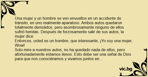 La mujer continúa: Y observe esto, he aquí otro milagro mi carro está completamente destruido pero esta botella de vino no se rompió. De seguro Dios quiere que nos la bebamos y celebremos nuestra buena suerte. Entonces, le pasó la botella al señor. El caballero asintiendo соn la cabeza, abre la botella y se da varios tragos monumentales. Luego se la devuelve a la mujer. La señora toma la botella, inmediatamente le pone la tapa y se la regresa al hombre. El hombre entonces le pregunta: