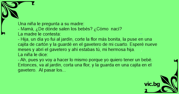 - Hija, un día yo fui al jardín, corte la flor más bonita, la puse en una cajita de cartón y la guardé en el gavetero de mi cuarto. Esperé nueve meses y abrí el gavetero y ahí estabas tú, mi hermosa hija.