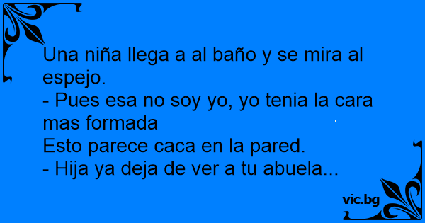 Български English Deutsch Una niña llega a al baño y se mira al espejo. - Pues esa no soy yo, yo tenia la cara mas formada Esto parece caca en la pared. - Hija ya deja de ver a tu abuela... Русский Français Italiano Ελληνικά Македонски Türkçe Українська Português Polski Svenska Nederlands Dansk Norsk Suomi Magyar Româna Čeština Lietuvių Latviešu Hrvatski