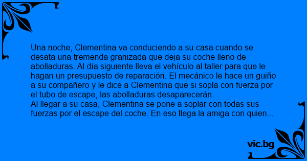 Una noche, Clementina va conduciendo a su casa cuando se desata una tremenda granizada que deja su coche lleno de abolladuras. Al día siguiente lleva el vehículo al taller para que le hagan un presupuesto de reparación. El mecánico le hace un guiño a su compañero y le dice a Clementina que si sopla соn fuerza por el tubo de escape, las abolladuras desaparecerán.