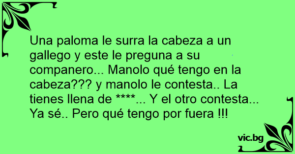 Una paloma le surra la cabeza a un gallego y este le preguna a su companero... Manolo qué tengo en la cabeza??? y manolo le contesta.. La tienes llena de ****... Y el otro contesta... Ya sé.. Pero qué tengo por fuera !!!
