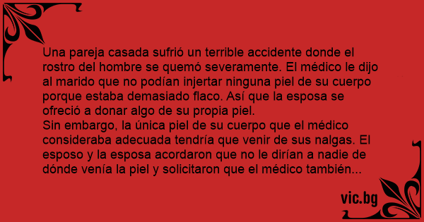 Una pareja casada sufrió un terrible accidente donde el rostro del hombre se quemó severamente. El médico le dijo al marido que no podían injertar ninguna piel de su cuerpo porque estaba demasiado flaco. Así que la esposa se ofreció a donar algo de su propia piel.