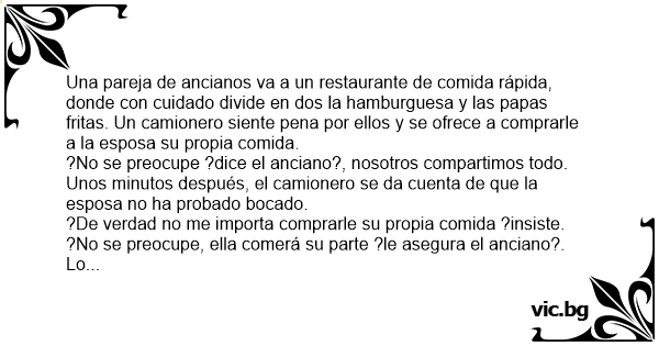 Una pareja de ancianos va a un restaurante de comida rápida, donde соn cuidado divide en dos la hamburguesa y las papas fritas. Un camionero siente pena por ellos y se ofrece a comprarle a la esposa su propia comida.