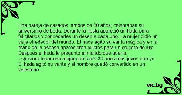 Сурово Η νεράιδα Мъж и жена празнуват 35-годишнина от сватбата в ресторант. Появила се фея и казала: Една фея казала на двама съпрузи: A husband and wife in their sixties were coming up on their 40th wedding anniversary. Ein 60jähriges Ehepaar sitzt beim Frühstück, plötzlich kommt eine Fee vorbei. Sagt die Fee: "Ihr habt beide einen Wunsch frei!" Sagt der Mann: Äh, ja also, ich hätte gerne eine Frau die dreißig Jahre jünger ist als ich!" Sagt die Fee: "Öhhh, mal sehen, das geht sicher", und schwingt ihren... Um casal comemorava as bodas de prata e também os seus 60 anos de idade. De repente apareceu uma fada e disse: — Como prêmio por terem sido um casal exemplar durante 25 anos, concederei um desejo a cada um de vocês! — Quero fazer uma viagem ao redor do mundo com o meu maridão! — pediu a mulher —... A gay couple had been partnered for 25 years and was celebrating the 60th birthday of one of them. During the party, a fairy appeared and said that because they had been such a loving couple all... Married couples, both 60 years old, were celebrating their 35th anniversary. During their party, a fairy appeared to congratulate them and grant them each one a wish. The wife wanted to travel... Ett gift par i 60-års åldern firade sin 40-åriga bröllopsdag på en lugn, romantisk liten restaurang Plötsligt dök en liten vacker fe upp på deras bord. Hon sa: - För att ni är ett exemplariskt... Frau und Mann haben beide ihren 60. Geburtstag. Erscheint eine Fee und sagt: „Ihr habt einen Wunsch frei.“ Sagt der Mann: „Ok, ich wünsche mir eine 30 Jahre jüngere Frau.“ Sagt die Fee: „Kein... A couple was celebrating their wedding anniversary. During the party, a fairy appered and said that she would grant them one wish each. The wife said: "I wish we could do a... Det var en gang ett ektepar som fikk besøk av en fe. Feen sa: – Fordi dere har vært gift i 30 år, skal dere få hver sitt ønske oppfylt. Så feen spurte først kona, hva ho ønska seg. Joda, ho ønsket... Er was een koppeltje van 70 jaar oud en ze vierden hun gouden bruiloft. Op het feest verscheen plots een fee. De fee zei: “Jullie mogen een wens doen. Je mag wensen wat je maar wilt.” “Dat is tof,”... Una coppia sta festeggiando le nozze d’argento e contemporaneamente anche i 60 anni di vita. Durante la celebrazione appare una fata e dice alla coppia: “come premio per la vostra fedeltà di 25... C’est un couple qui a déjà fêté ses noces d’argent (25 ans de mariage) et qui fête aujourd’hui le cinquantième anniversaire du mari. Pendant la fête, une fée apparaît et leur dit : - Vous avez tous... Der var engang en fe der sagde til et par: "Nu har I været gift i 30 år uden at skændes ret meget, så derfor får I hvert et ønske. Konen først." Konen svarede: "Så vil jeg da gerne rejse verden... Hvad du ønsker skal du få Et ægtepar skulle fejre deres 35 års bryllupsdag da de fik besøg af en fe. Feen sagde: - Da I er sådan et smukt par og har været sammen i så mange år giver jeg jer et... Spændende indianerridning En attraktiv kvinde fra New York kørte igennem en ret øde egn i Texas, da hendes bil bryder sammen. En indianer til hest kommer hende til undsætning og tilbyder at ride... O zana spune unui cuplu: - Pentru ca sunteti un cuplu exemplar chiar si dupa 30 de ani de casatorie, voi indeplini cate o dorinta fiecaruia dintre voi. Sotia spune: - Eu as dori sa fac turul lumii... Une fée dit à un couple marié : - Pour avoir été un couple si exemplaire depuis 25 ans, je vous accorde à chacun un vœu. La femme dit alors : - Je voudrais faire le tour du monde avec mon mari... Michael und Susanne sind beide 55 Jahre alt und seit 20 Jahren verheiratet. Eines schönen Tages gehen beide im Wald spazieren und treffen dort eine magische Fee. Die magische Fee sagt zu den... De havde været gift i 25 år. og samtidig fejrede de begge deres 60 års fødselsdage. Mens de fejrede det hele, viste en fe sig pludseligt og sagde, at fordi de havde været så søde mod hinanden i...