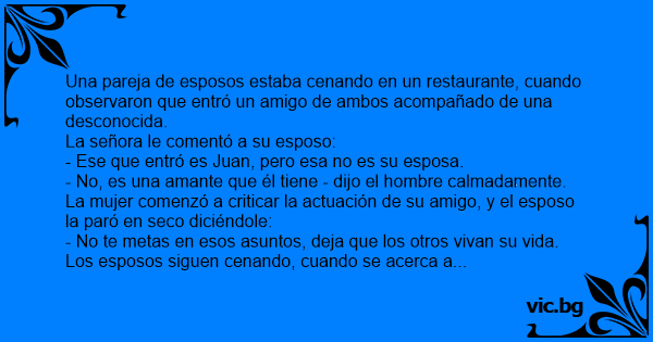 Una pareja de esposos estaba cenando en un restaurante, cuando observaron que entró un amigo de ambos acompañado de una desconocida.
