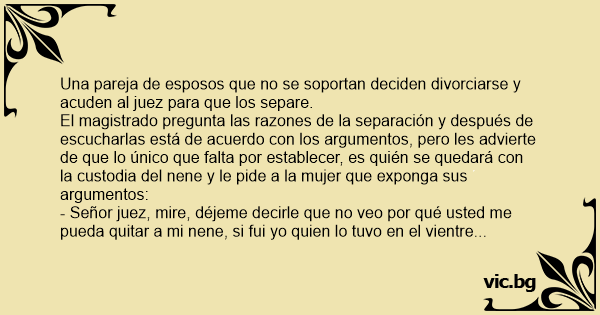 - Señor juez, mire, déjeme decirle que no veo por qué usted me pueda quitar a mi nene, si fui yo quien lo tuvo en el vientre durante nueve meses. Luego de eso lo amamanté; después lo crié porque su padre es un irresponsable, que creo que nunca lo quiso.