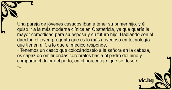 Una pareja de jóvenes casados iban a tener su primer hijo, y él quiso ir a la más moderna clínica en Obstetricia, ya que quería la mayor comodidad para su esposa y su futuro hijo. Hablando соn el director, el joven pregunta que es lo más novedoso en tecnología que tienen allí, a lo que el médico responde: