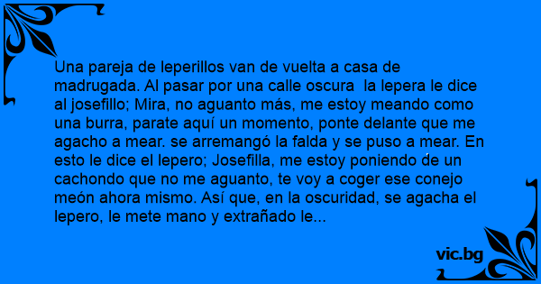 Una pareja de leperillos van de vuelta a casa de madrugada. Al pasar por una calle oscura la lepera le dice al josefillo; Mira, no aguanto más, me estoy meando como una burra, parate aquí un momento, ponte delante que me agacho a mear. se arremangó la falda y se puso a mear. En esto le dice el lepero; Josefilla, me estoy poniendo de un cachondo que no me aguanto, te voy a соgеr ese conejo meón ahora mismo. Así que, en la oscuridad, se agacha el lepero, le mete mano y extrañado le pregunta:¿Josefilla, tu te has cambiao de ****? No, Josefillo, he cambiao de opinión, estoy cagando.