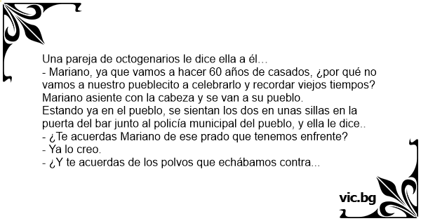 - Mariano, ya que vamos a hacer 60 años de casados, ¿por qué no vamos a nuestro pueblecito a celebrarlo y recordar viejos tiempos?