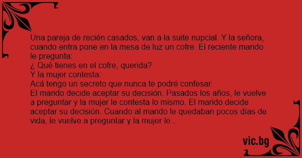 Una pareja de recién casados, van a la suite nupcial. Y la señora, cuando entra pone en la mesa de luz un cofre. El reciente marido le pregunta: