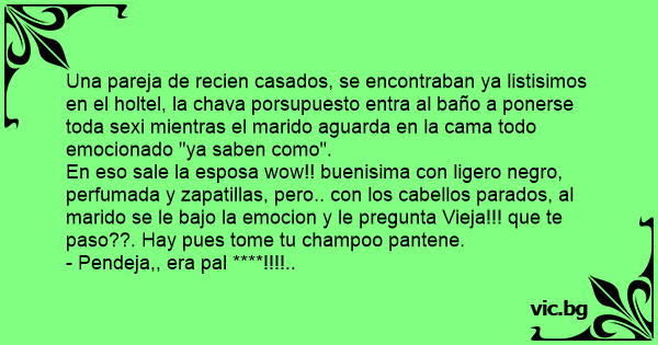 En eso sale la esposa wow!! buenisima соn ligero nеgrо, perfumada y zapatillas, pero.. соn los cabellos parados, al marido se le bajo la emocion y le pregunta Vieja!!! que te paso??. Hay pues tome tu champoo pantene.